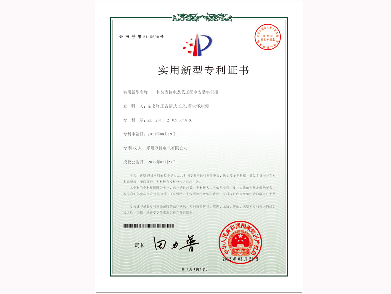 公司實用新型專利證書